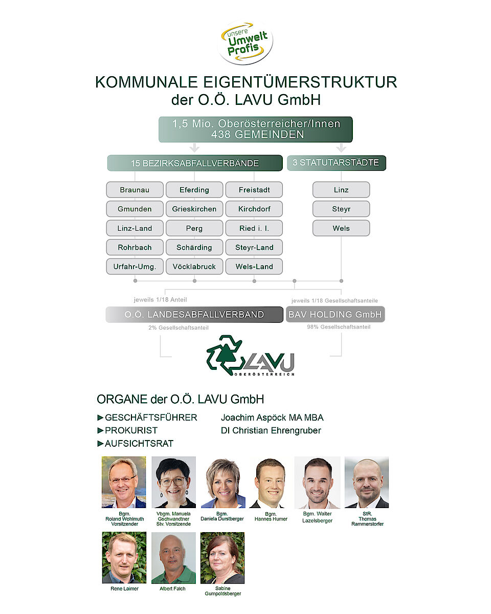 Unsere kommunale Eigentümerstruktur besteht aus allen 438 oberösterreichischen Gemeinden und Städten, den 15 Bezirksabfallverbänden, 3 Statutarstädten sowie dem Landesabfallverband, den Umweltprofis. Diese Einheit in der Vielfalt garantiert Sicherheit, Transparenz, Vertrauen und bildet die beste Basis für eine Beständigkeit, die langfristige Stabilität und Kontinuität in Zeiten wechselnder globaler Rahmenbedingungen gewährleistet.